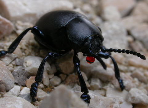 The bloody-nosed beetle is a large, round, flightless beetle with long legs that can often be seen plodding across paths or through grass. It can be found during the spring and summer in grassland, heathland and along hedgerows. One of our largest 'leaf beetles', adults feed on the leaves of lady's bedstraw and related plants, and the larvae can be seen hanging from these species. Adults are mostly active at night.How to identify