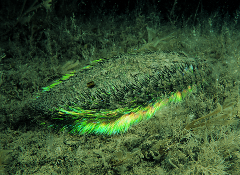 The sea mouse is marine worm. Its body is covered in bristles - giving it a furry appearance. At the fringes are beautiful iridescent bristles that shimmer blue, green and gold. The sea mouse is an active predator, hunting small crabs and other worms on the seabed.